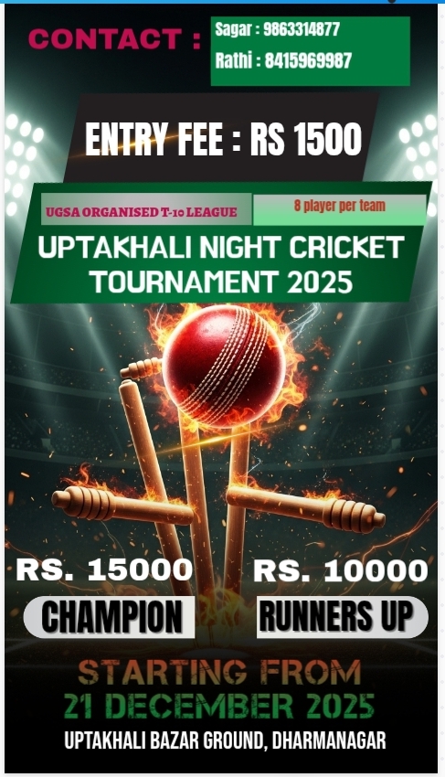 Uptakhali Games and Sports Association has organised a "T10 Cricket tournament" on Uptakhali bazar ground . We invite all the captains, coach and team manager of their respective team to join our tournament with best players on or before 22nd December 2025 to make our tournament a grand success.Few information :1. Offline and Online Registration opens before 22nd December 2025.2. Trophies will be distributed to Winner and Runner (Along with rs 15000 and rs 10000) . Trophies for Man of the Tournament,Best Bowler/Batsman/keeper,Most valuable fans etc will be there.3. Deposit Entry fee Rs.1500 on or before 22nd December 2025.4. Match schedule will be published on 22.12.2023 at 9:00 pm (UGSA,Uptakhali or m.bbsau7.webnode.in ) .5. All the matches of this tournament will be played as per scheduled date and time only.6. First match will be played on 23rd Decembet 2025 at 6.30 pm.7. During a match umpire's decision will be taken as final.8. Submit team list one hour before the toss.9. Rs.100 will be fined for every 5 min late .10. For the every match team must have to submit Rs.100 for ball.11. Every team Must have to include their respective Village/ Town/City along with their team Name (ex: Super sixer Dharmanagar or Agartala Playing Xi etc).12. You can enjoy live scoring ball by ball of the whole tournament by downloading UGSA cricheroes App, to download click below link bbsau7.webnode.in/live-score/For more information you can Contact Us at UGSA,Uptakhali or 8415087476, 8787544291